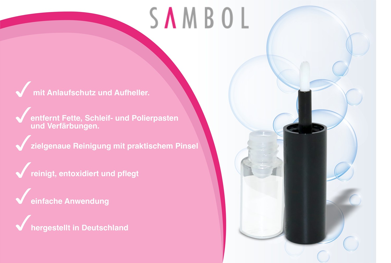 Der Sambol Gold und Silber-Reiniger reinigt, endoxidiert und pflegt mit einem hochwertigen Aufheller. Außerdem verfügt dieser Reiniger über einen optimierten Anlaufschutz. Zur zielgenauen Reinigung Ihres Schmuckes hilft ein Pinsel, mit dem das Reinigungsmittel aufgetragen wird. Das Produkt ist gebrauchsfertig und Cyanid frei. Da die Anwendung leicht und unkompliziert ist, eignet sich das Produkt perfekt für den Hausgebrauch.