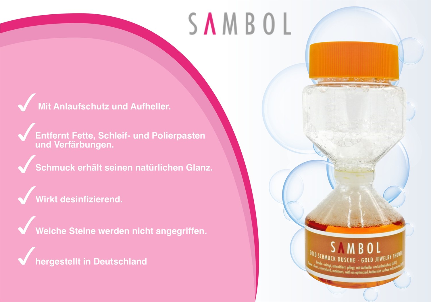 Die Sambol Gold Schmuck Wäsche reinigt, entoxidiert und pflegt Gold und Goldschmuck. Durch die einfache Anwendung lassen sich Ketten, Armbänder Ringe und Co. auffrischen und pflegen. So wird das geliebte Schmuckstück schnell wieder in neuem Glanz erstrahlen. Die Sambol Gold Schmuckwäsche reinigt nicht nur, der Schmuck wird außerdem mit einem professionellen Anlaufschutz versehen. Die Anwendung der Schmuckwäsche ist denkbar einfach und eignet sich so bestens für den Hausgebrauch. So werden Sie noch lange Freude an Ihrem Gold haben.