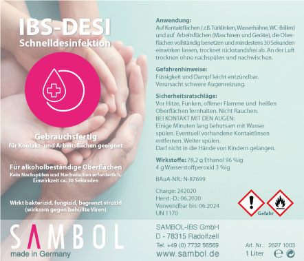 IBS-DESI Schnelldesinfektion passend für Eurospender ist gebrauchsfertig und ist für Kontakt- und Arbeitsflächen geeignet.