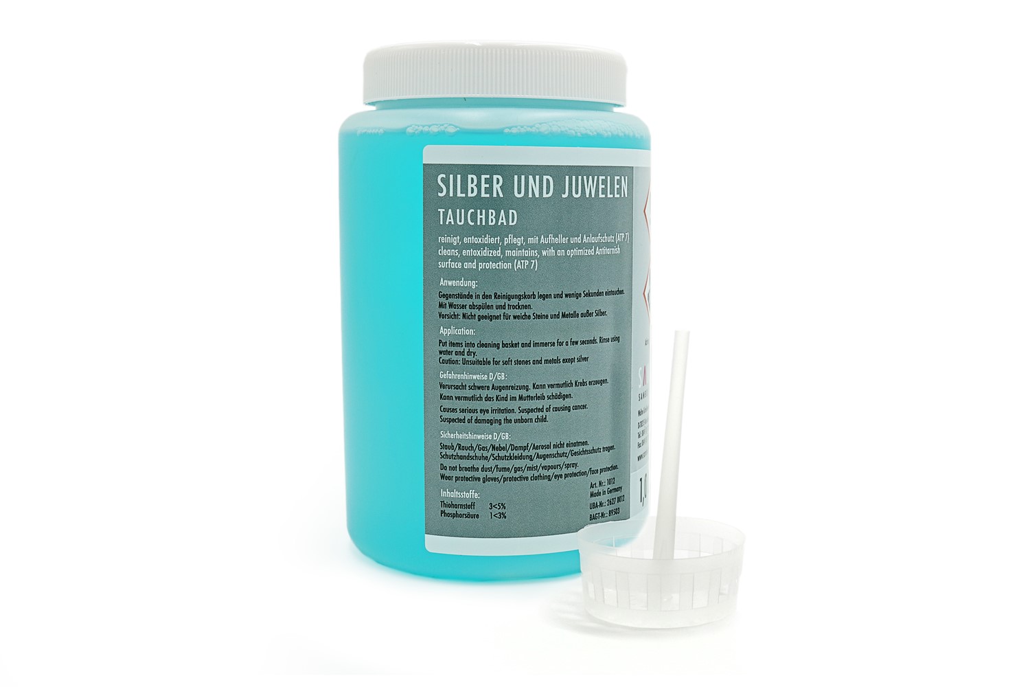 Silber-Tauchbad Set besteht aus 1000 ml Tauchbad mit Tauchkorb und 30 ml Silberanlaufschutz alkoholisch