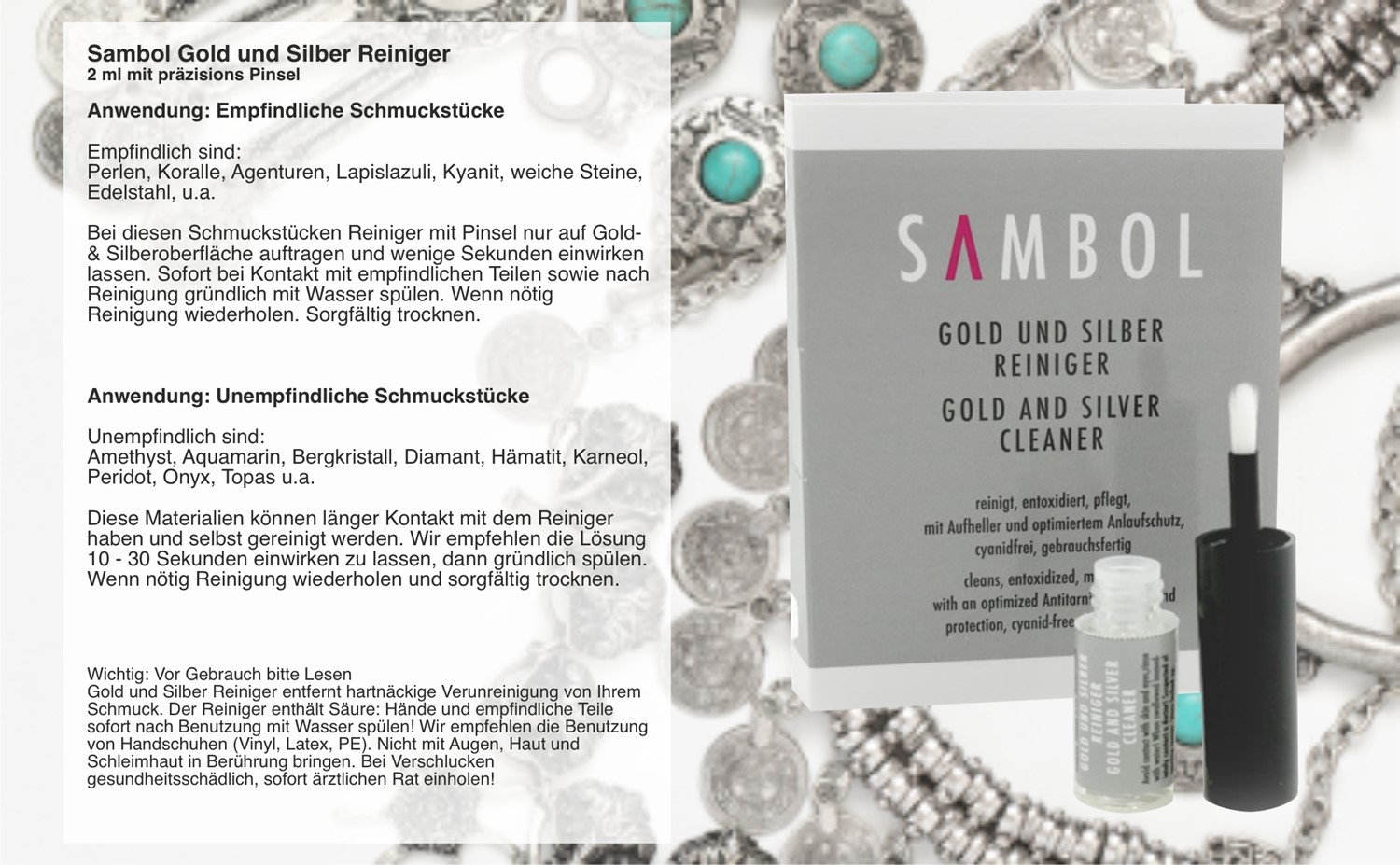 Der Sambol Gold und Silber-Reiniger reinigt, endoxidiert und pflegt mit einem hochwertigen Aufheller. Außerdem verfügt dieser Reiniger über einen optimierten Anlaufschutz. Zur zielgenauen Reinigung Ihres Schmuckes hilft ein Pinsel, mit dem das Reinigungsmittel aufgetragen wird. Das Produkt ist gebrauchsfertig und Cyanid frei. Da die Anwendung leicht und unkompliziert ist, eignet sich das Produkt perfekt für den Hausgebrauch.