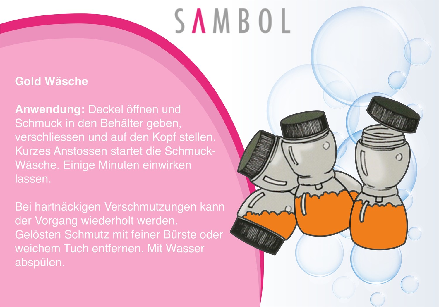 Die Sambol Gold Schmuck Wäsche reinigt, entoxidiert und pflegt Gold und Goldschmuck. Durch die einfache Anwendung lassen sich Ketten, Armbänder Ringe und Co. auffrischen und pflegen. So wird das geliebte Schmuckstück schnell wieder in neuem Glanz erstrahlen. Die Sambol Gold Schmuckwäsche reinigt nicht nur, der Schmuck wird außerdem mit einem professionellen Anlaufschutz versehen. Die Anwendung der Schmuckwäsche ist denkbar einfach und eignet sich so bestens für den Hausgebrauch. So werden Sie noch lange Freude an Ihrem Gold haben.