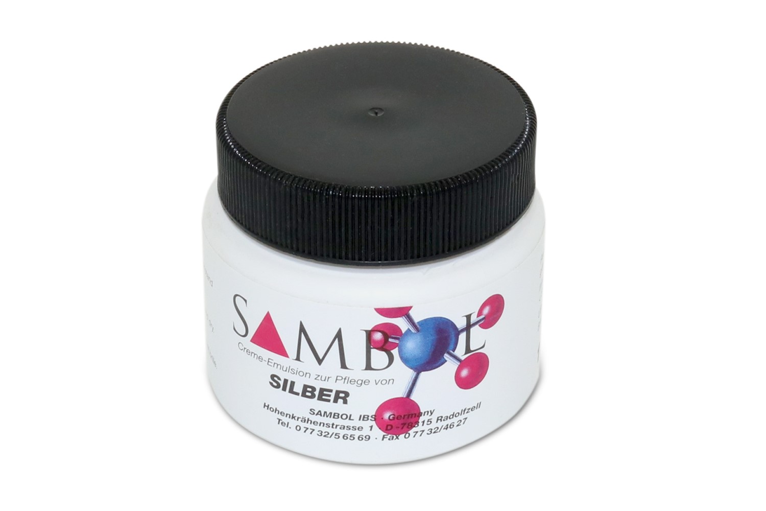 Die Sambol Silber–Creme–Emulsion verfügt über eine außergewöhnlich gute Reinigungskraft. Das Spray reinigt, poliert und versiegelt Ihre Schmuckstücke mit einer hochwertigen Langzeitversiegelung. Der optimierte Anlaufschutz verzögert Verfärbungen und schützt wirkungsvoll vor Wiederanlaufen. Bringen Sie Ihre Kostbarkeiten wieder zum Glänzen! Die Sambol Silber–Creme–Emulsion ist geeignet für Echtsilber, versilberten, mattierten Schmuck und Korpuswaren. Zur optimalen Ergänzung empfehlen wird eines unserer Reinigungs- und Pflegetücher. Diese, sowie weitere Pflegeprodukte für Ihre Edelmetalle finden Sie in unserem Shop!