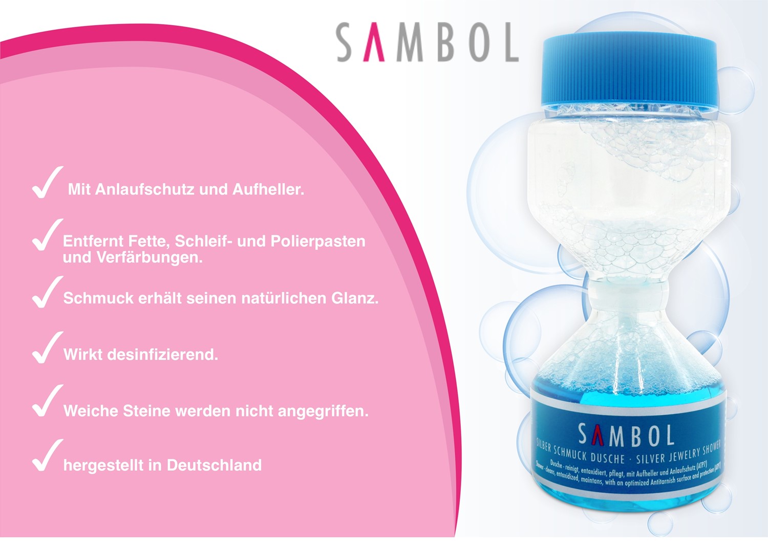 Die Sambol Silber Schmuck-Wäsche reinigt, entoxidiert und pflegt Silber und Silberschmuck. Durch die einfache Anwendung lassen sich Ketten, Armbänder Ringe und Co. auffrischen und pflegen. So wird das geliebte Schmuckstück schnell wieder in neuem Glanz erstrahlen. Die Sambol Silber Schmuckwäsche reinigt nicht nur, der Schmuck wird außerdem mit einem professionellen Anlaufschutz versehen. Die Anwendung der Schmuckwäsche ist denkbar einfach und eignet sich so bestens für den Hausgebrauch. So werden Sie noch lange Freude an Ihrem Silber haben.